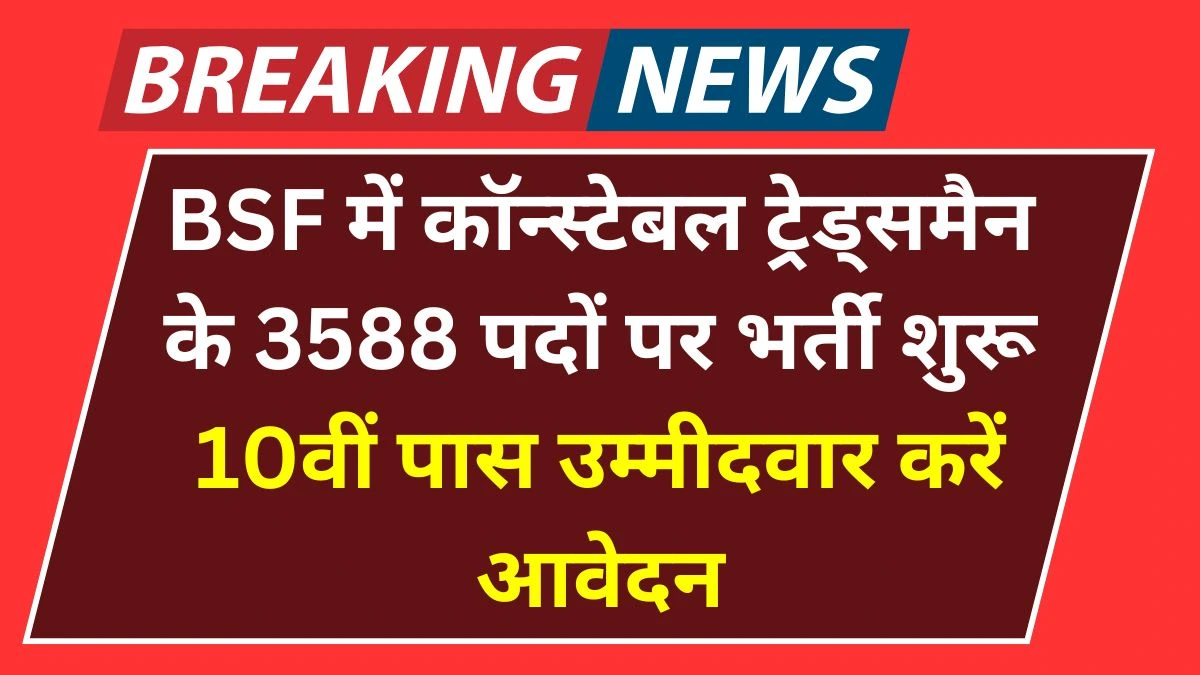 BSF Recruitment 2025: बॉर्डर सिक्योरिटी फोर्स (BSF) ने कॉन्स्टेबल ट्रेड्समैन के कुल 3588 पदों पर भर्ती का नोटिफिकेशन जारी किया है। इस भर्ती की आवेदन प्रक्रिया 25 जुलाई 2025 से शुरू हो चुकी है। इच्छुक और योग्य उम्मीदवार आधिकारिक वेबसाइट पर जाकर ऑनलाइन आवेदन कर सकते हैं।