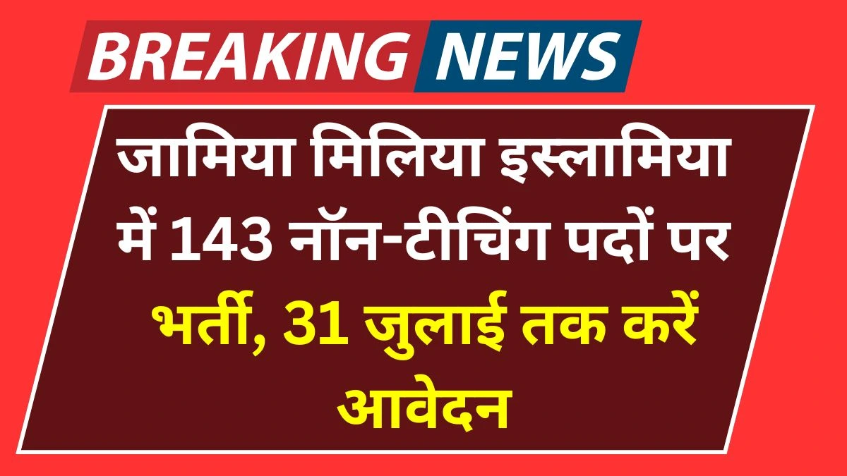 JMI Non Teaching Recruitment 2025: दिल्ली स्थित जामिया मिलिया इस्लामिया (JMI) ने बड़ी संख्या में नॉन-टीचिंग पदों पर भर्ती का नोटिफिकेशन जारी किया है। इस भर्ती के तहत कुल 143 पदों को भरा जाएगा। इच्छुक उम्मीदवारों को आवेदन प्रक्रिया ऑफलाइन माध्यम से पूरी करनी होगी। आवेदन की अंतिम तिथि 31 जुलाई 2025 तय की गई है ।
